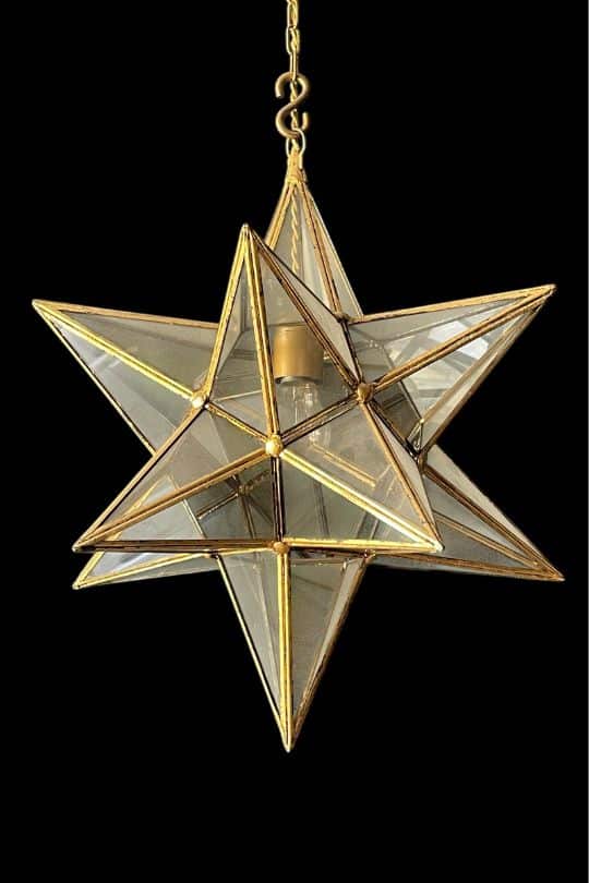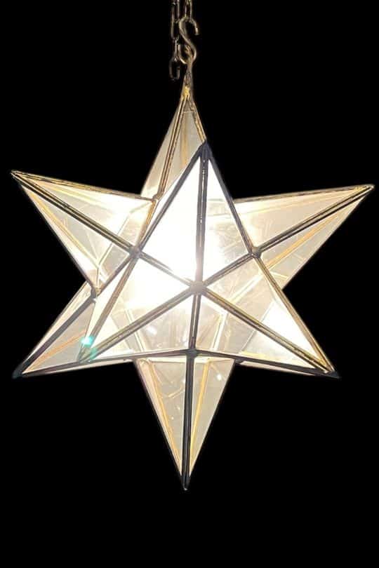 The brass frame elegantly highlights each edge of the star, while the glass diffuses the light softly, revealing the bulb for a decorative and luminous effect.