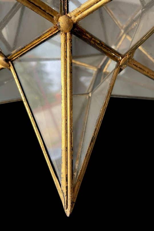 A stunning pair of faceted star-shaped pendant lights, composed of a gold-leafed metal frame and glass shades. Their geometric design, inspired by Moorish lanterns and mid-century lighting, offers a subtle interplay of transparency and reflections.