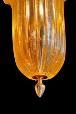 Chaque élément est constitué d’un diffuseur en verre soufflé cannelé, enrichi d’inclusions de poudre d’or, garantissant une diffusion lumineuse homogène et un éclat métallique caractéristique des productions de l’île de Murano.
